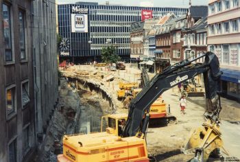 Arbejdet med frilægningen af Aarhus Å mellem Immervad og Skt. Clemens Bro. Fotograf: Anita Strømberg Kimborg, 1995, Aarhus Stadsarkiv.