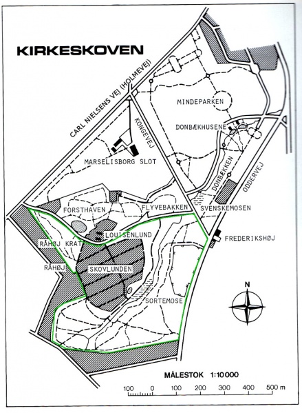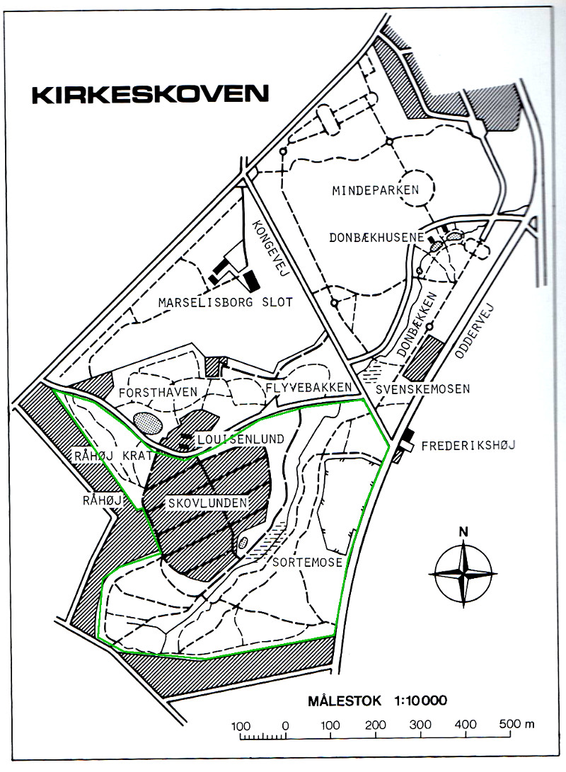 Kort over Kirkeskoven i Marselisborgskovene. Kort fra 1974. Grønt markeret område er det der i dag kaldes Kirkeskoven Kilde: Bernhardt Jensen: Marselisborgskovene. 1974