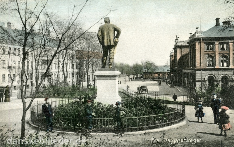 Banegårdspladsen med statuen af Dalgas. Til højre banegården. Postkort omkring 1905