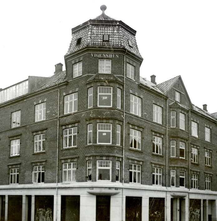 Vigenshus på hjørnet af Vester Allé og Vestergade. Omkring 1910 - Foto: Hans Wahlis Nolken Petersen. danskebilleder.dk
