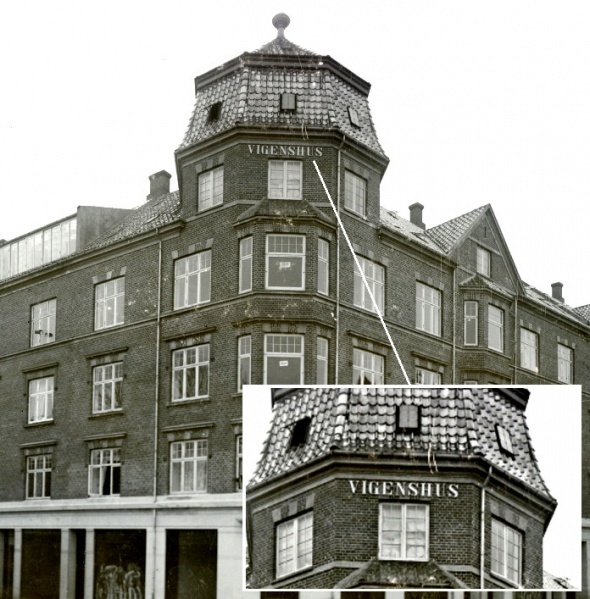 27. aug. 2018, 12:17Miniature af versionen fra 27. aug. 2018, 12:17696 × 707 (150 KB)Kurt L (diskussion | bidrag)Vigenshus på hjørnet af Vester Allé og Vestergade. Omkring 1910 - Foto: Hans Wahlis Nolken Petersen. danskebilleder.dk