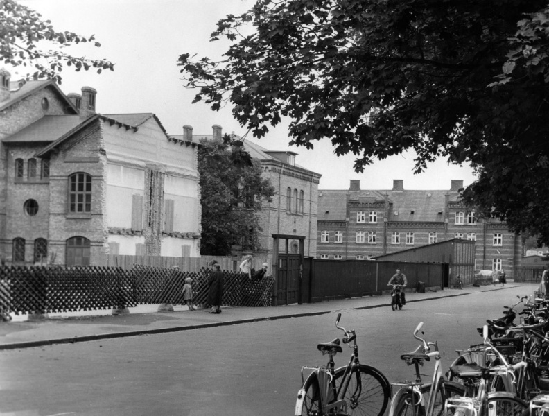 Dagmarsgade set mod Valdemarsgade. Frederiks Allés Skole og Valdemarsgades Skole under ombygning. Gymnastiksalen mellem de to skoler er ved at blive nedrevet. Foto 1959 - Foto: Rahbek-Clausen, danskebilleder.dk