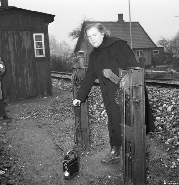 Jernbanen har spillet en vigtig rolle i Skødstrup Kommunes udvikling, og tidligere havde både Skødstrup og Løgten sin egen stationsbygning med dertil hørende personale. Her er det ledvogterske, fru Mary Hansen ved stationen i Løgten.