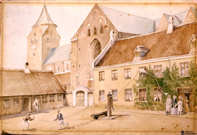Leg i Bispegården. Frederik Visby har her gengivet Bispegården, som den så ud, sandsynligvis da han selv var dreng. Det skønnes, at han har portrætteret sig selv, som en af drengene, der leger med dragen - iført blå og hvid stribede bukser og blå jakke. Foran hoveddøren står biskop Gerhard Peter Brammer med sin kone, Nielsine Henrikke Brammer, og døtre.