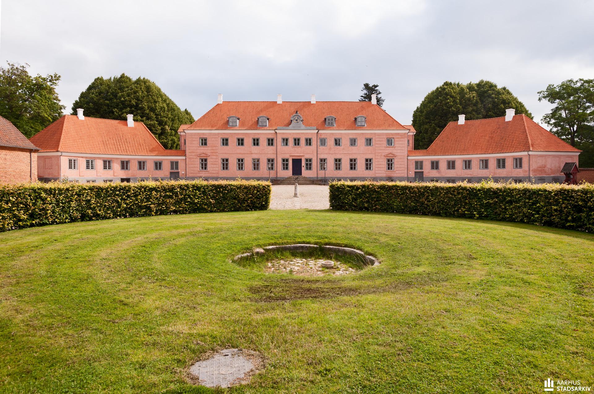 Indgangsparti ved Moesgaards hovedbygning fotograferet fra gårdspladsen. Fotograf Ib Nicolajsen, 2015, Aarhus Stadsarkiv.