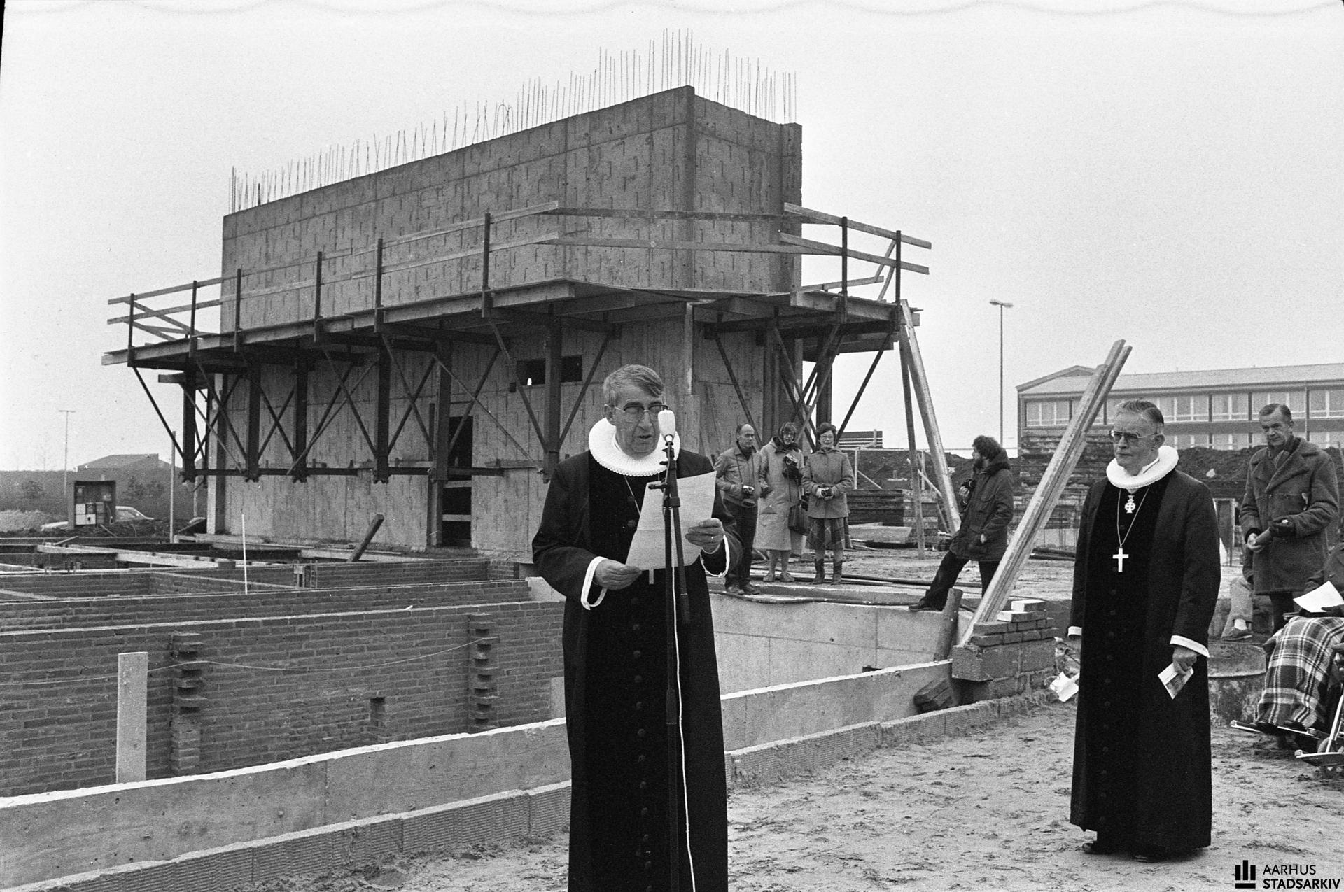 Biskop Herluf Eriksen taler ved grundstensnedlægningen til Helligåndskirken Herredsvang i Aarhus Vest 29. marts 1983. Kirken er tegnet af arkitekt Hans Knudsen fra arkitektfirmaet Sahl & Thomsen-Hans Knudsen, Risskov. Fotograf Ib Hansen, 1983, Aarhus Stadsarkiv.