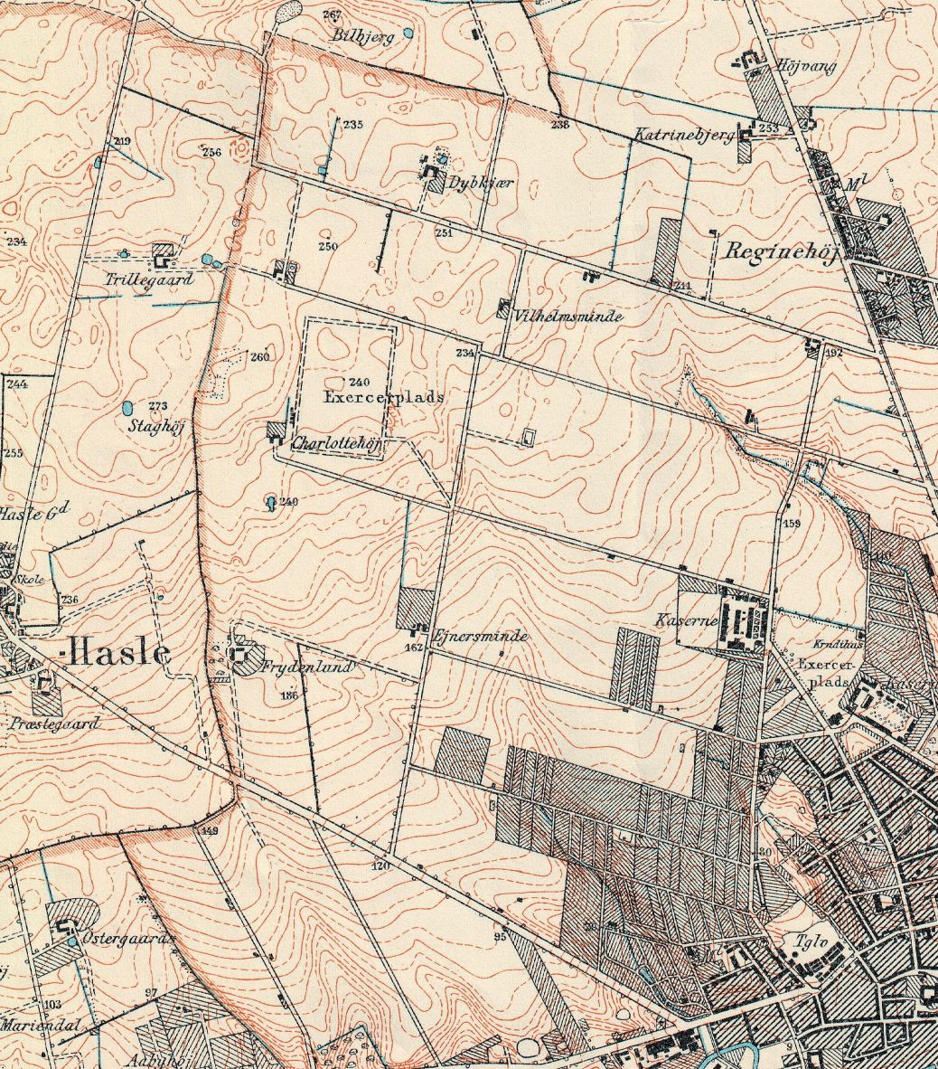 Udsnit af kort over Aarhus fra omkring år 1900. Kortet er skåret til ved området, som bymarken Møllevangen dækkede. Møllevangen strakte sig oprindeligt fra Viborgvej i syd til den rødstiplede linje man ser lige nord for Dybkjær i nord. Den vestlige grænse gik videre ned langs den rødstiplede linje lige øst for Hasle, mens grænsen i øst gik langs Langelandsgade, hvorved man på kortet kan se Artillerikasernen ved Langelandsgade. Udsnit af kort fra Generalstabens Topografiske Kort. Kilde: Historiskekort.dk.