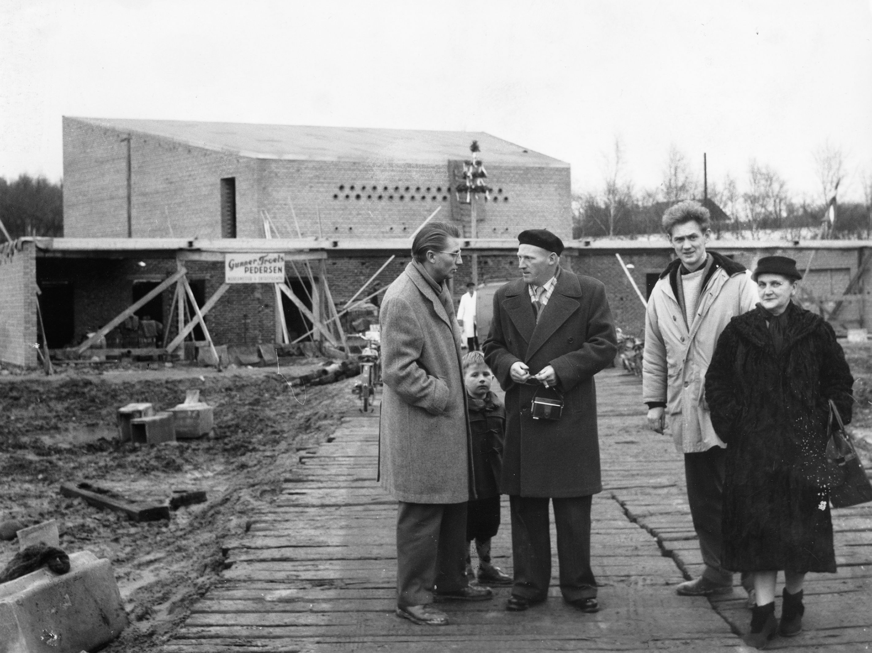 Rejsegilde på Vest-Teatret i Brabrand i 1957. Fra venstre: arkitekt Knud Blach Petersen (1919-2008), kommuneingeniør Berggren Jensen, arkitekt Knud Friis og kæmner og modstandskvinde fru Magda Baes Hansen (1906-1975).