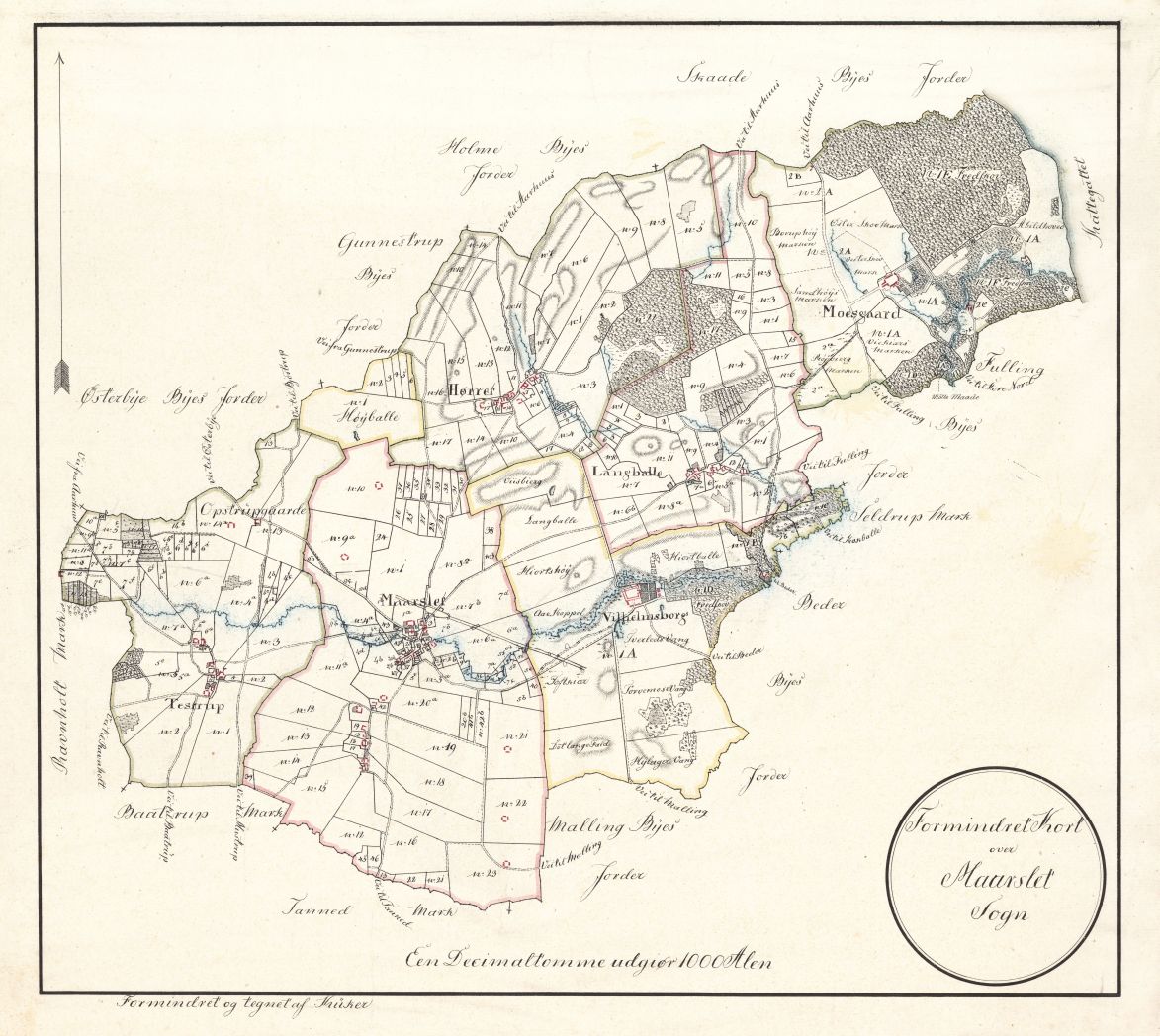 Kort over Mårslet Sogn med landsbyerne Mårslet, Testrup, Hørret, Langballe samt herregårdene Vilhelmsborg og Moesgaard ca. 1840, tegnet af Krüker.