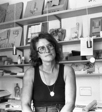 Arkitekt Inger Exner i sit hjem på Marselisvej 19. Fotograf Børge Venge, 1976, Aarhus Stadsarkiv.